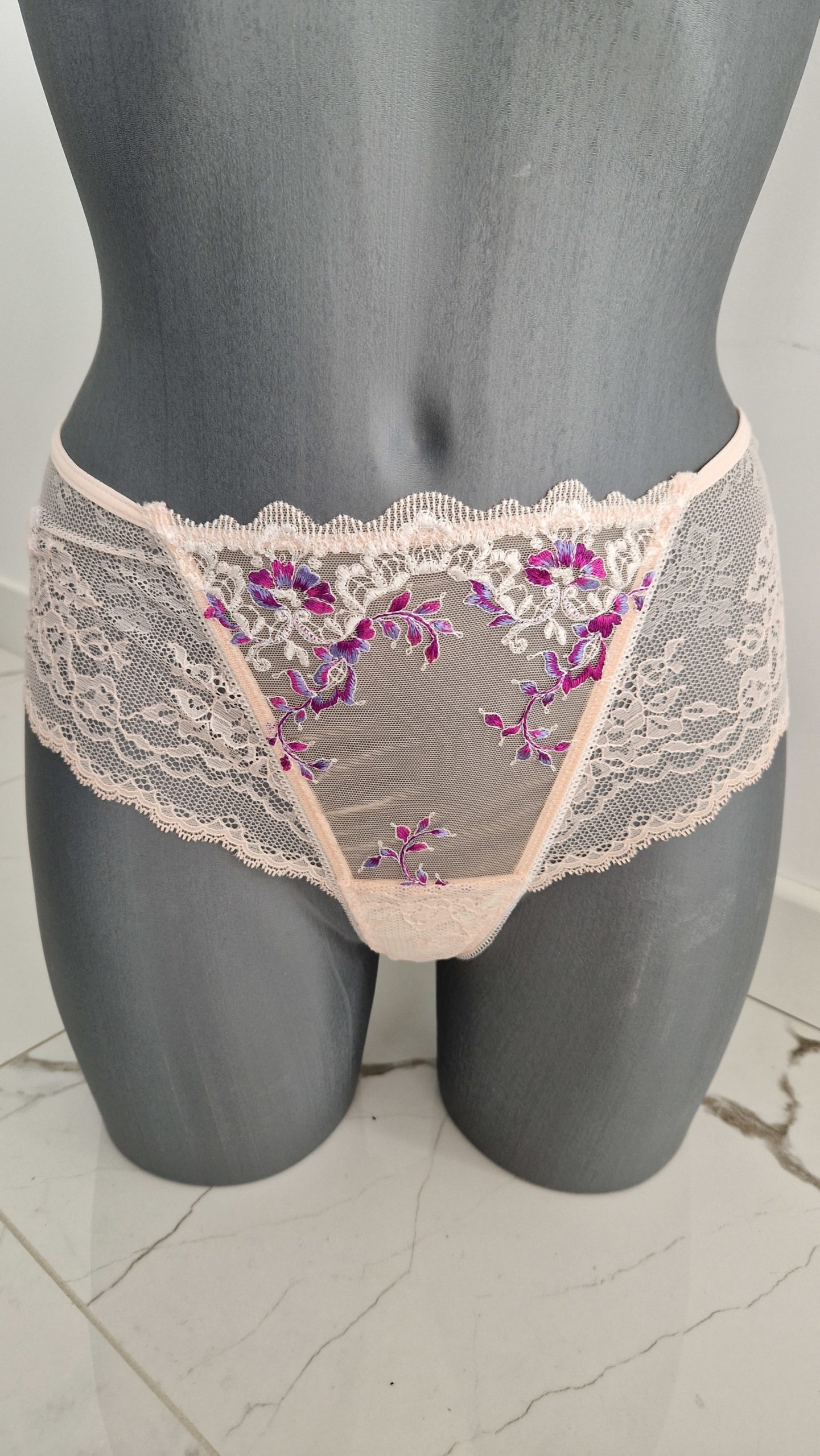 – Le devant de la culotte emboitante est en dentelle et tulle brodé