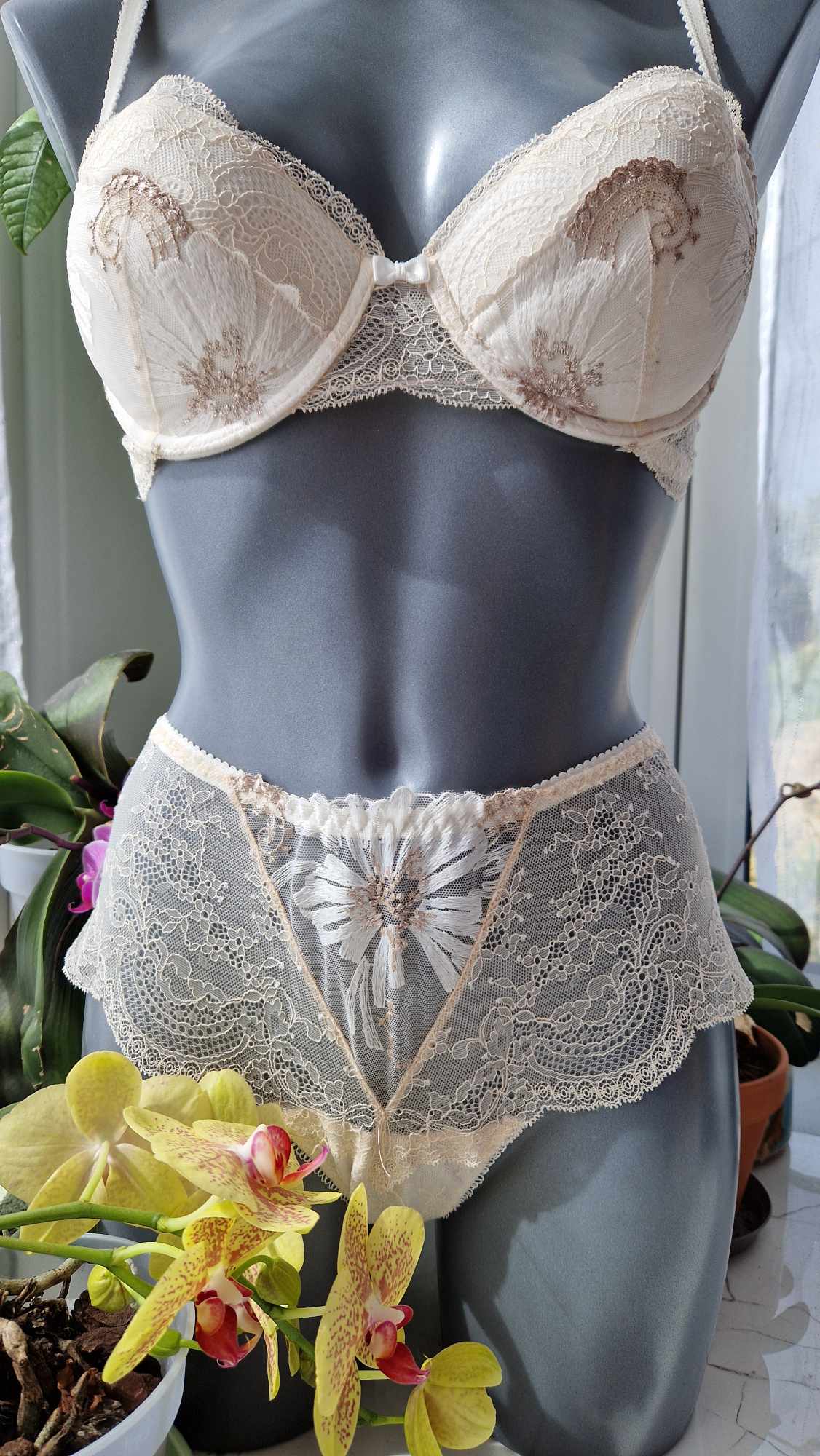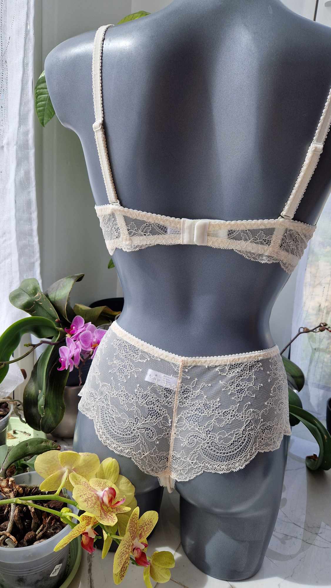 Ce shorty en dentelle et tulle brodé est un véritable chef-d’œuvre. La dentelle et le tulle brodé cousu avec fil d’or sont de qualité supérieure et proviennent d’Italie. Le shorty est entièrement en tulle à l’arrière, tandis que l’avant est orné de dentelle et de tulle brodé. La fabrication est faite main, ce qui garantit une qualité exceptionnelle. La couleur écrue de la dentelle ajoute une touche de sophistication à cette pièce unique. Ce shorty est parfait pour les occasions spéciales ou pour se sentir belle et élégante au quotidien.