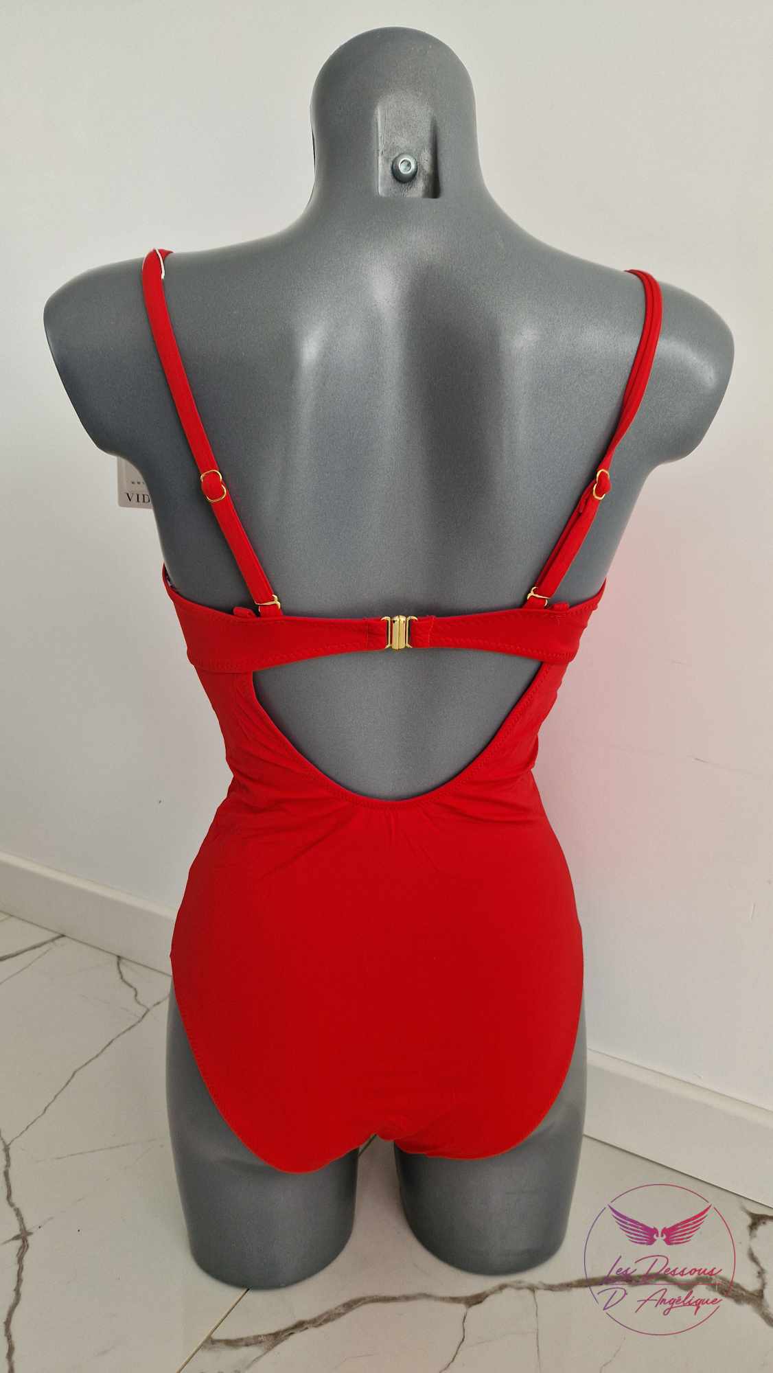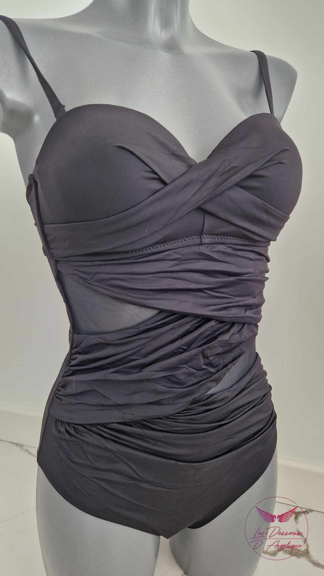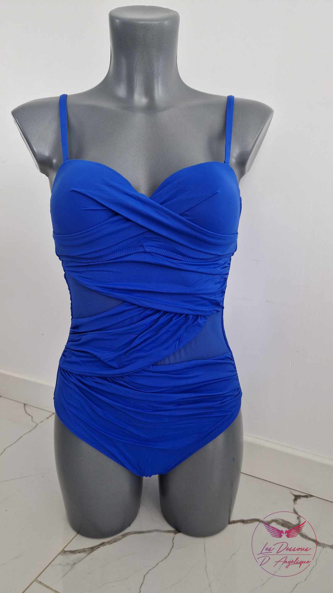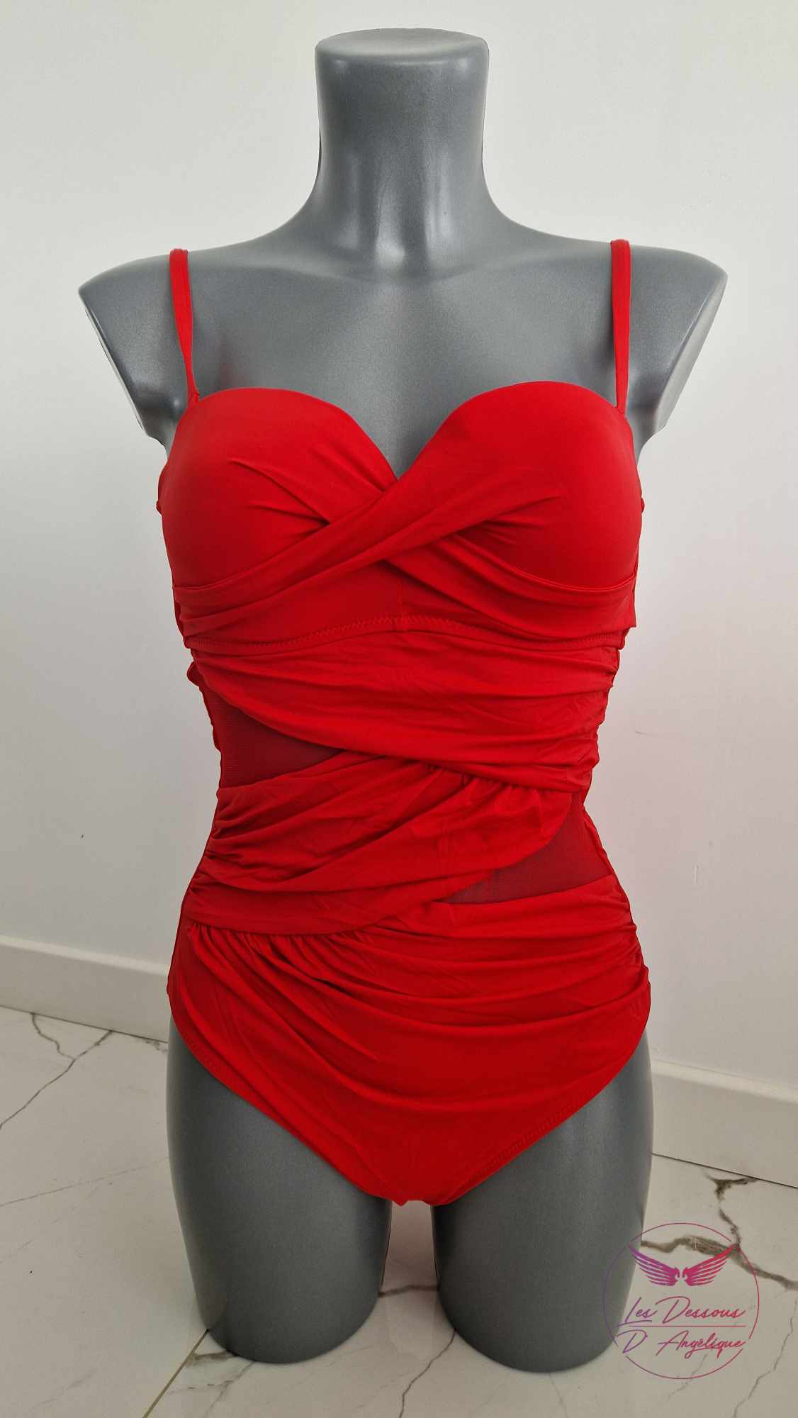 Maillot de bain 1 pièce uni, disponible en noir, rouge ou bleu. Coques forme corbeille pour un joli galbe, empiècement en tulle au ventre et effet plissé raffiné. Bretelles amovibles. Taille petit, prenez une taille au-dessus. Élégant, gainant et confortable.