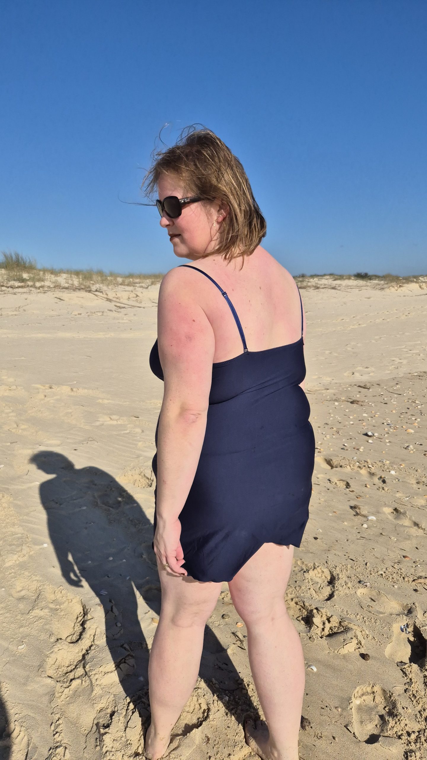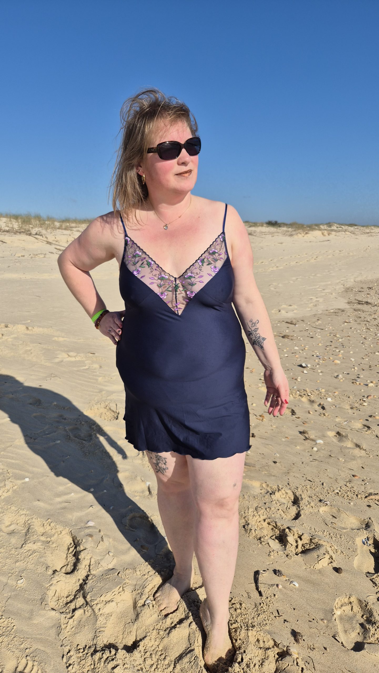 Son bleu marine profond évoque la sérénité et met en valeur la peau, tandis que la broderie florale délicate apporte une touche de poésie. Sa structure étudiée assure un confort sans sacrifier la féminité.