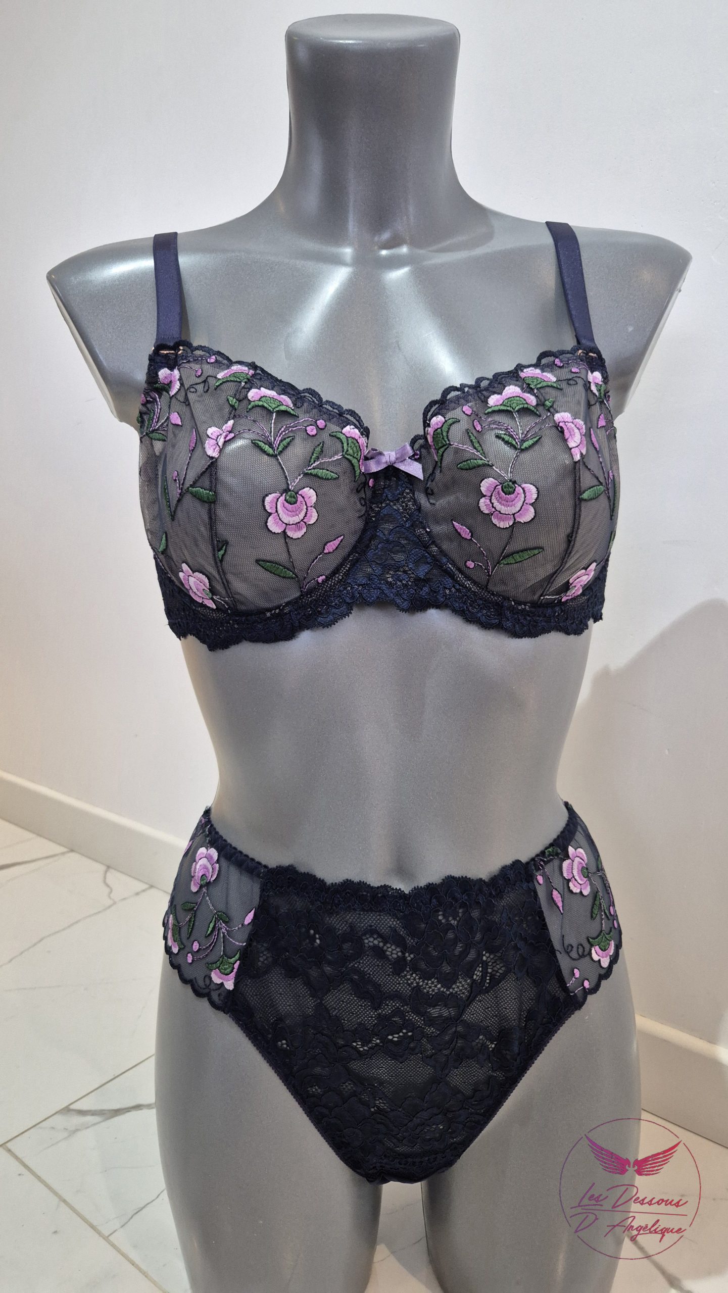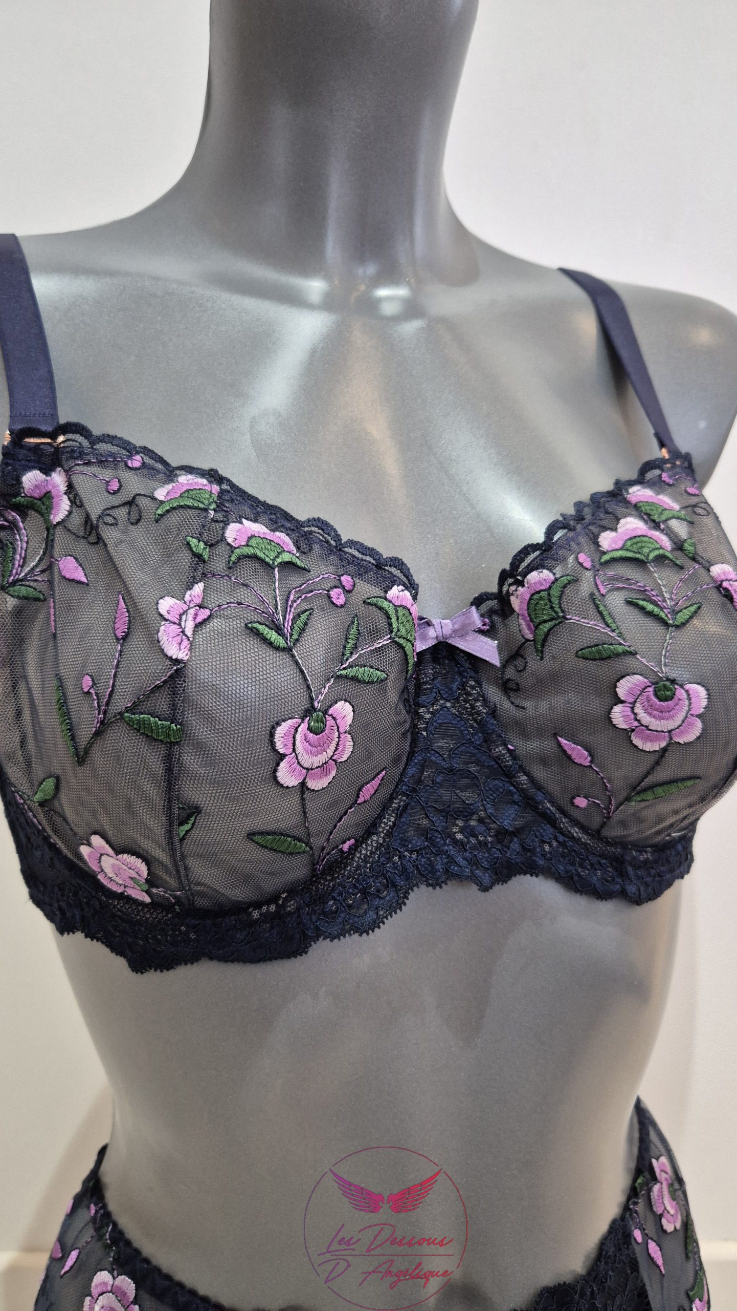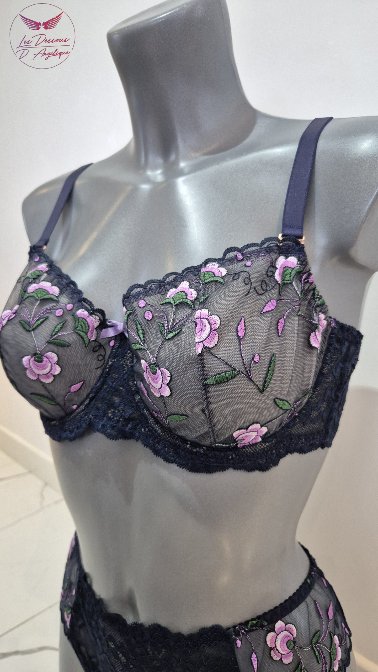 soutient gorge de forme corbeille en dentelle Bleu marine et tulle brodé mauve
