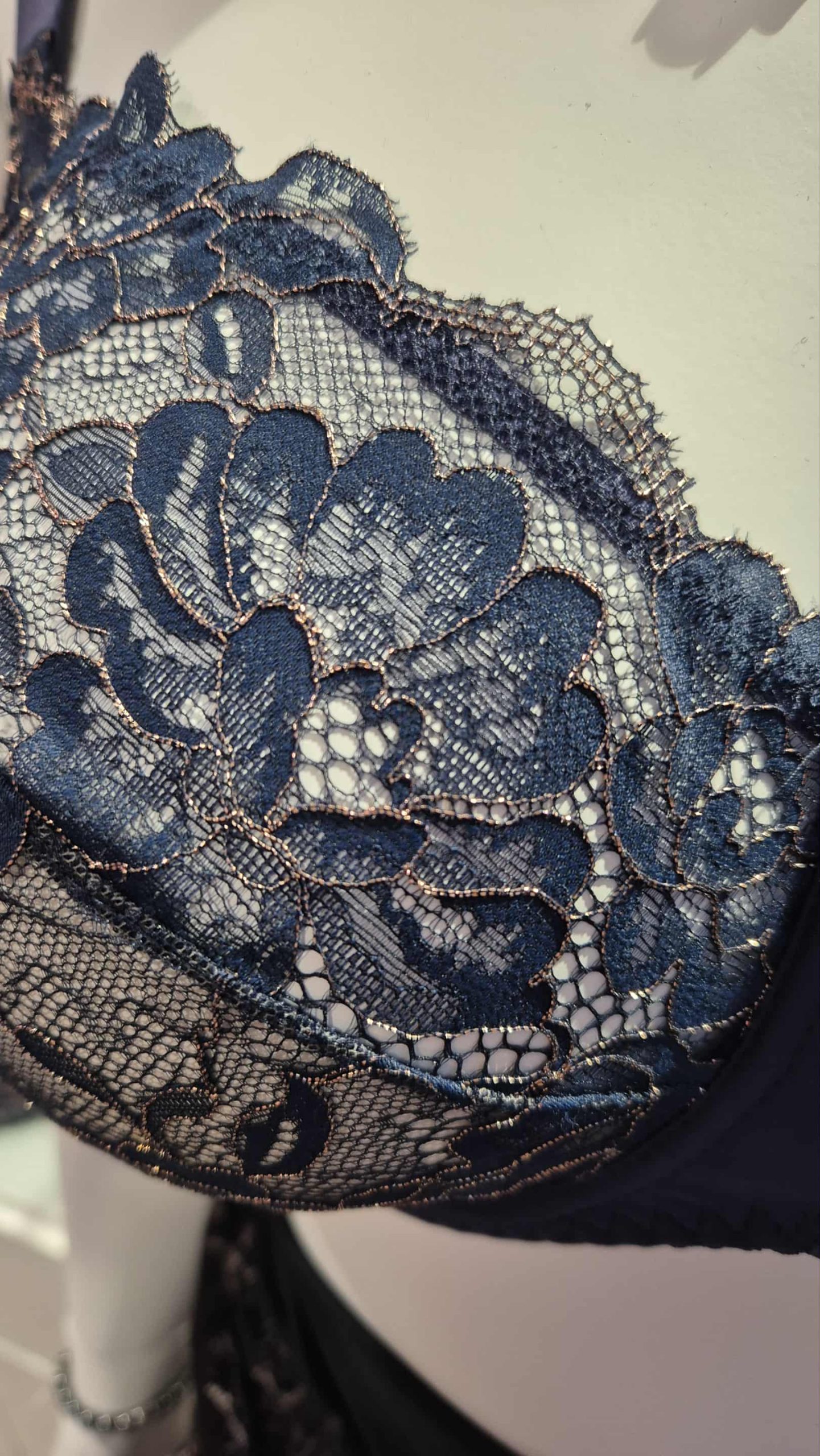 Détail: Le Padded Saphir est conçu pour allier confort et élégance. Sa dentelle italienne d’un bleu marine est rehaussée par des fils de lurex doré délicats.