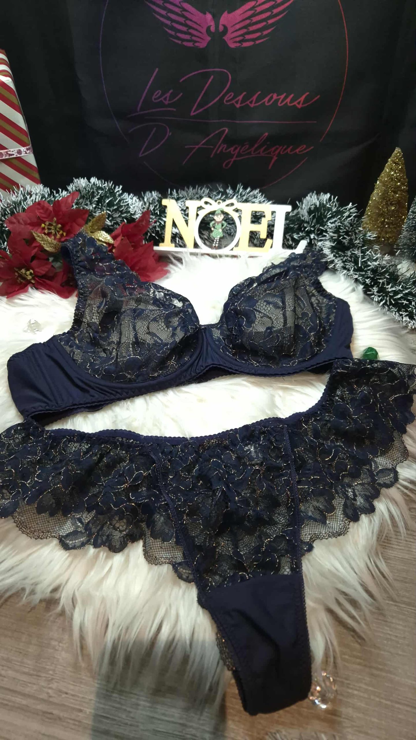 Sur fond de dentelle bleu marine et lurex doré.